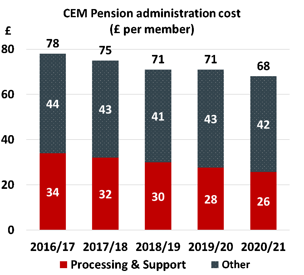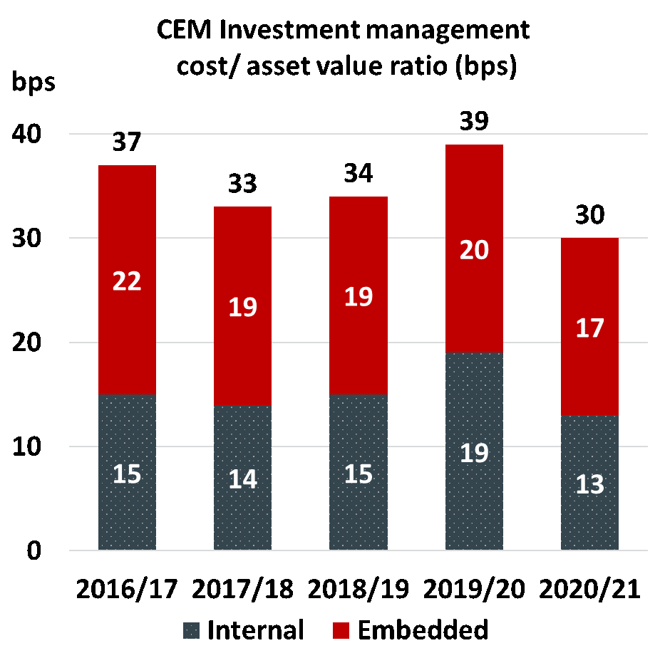 CEM Benchmarking is an independent company working in the pension sector that benchmarks costs between peers every year. Participants’ reported costs are adjusted to harmonise cost treatments and, as far as is possible, provide like-for-like comparisons.